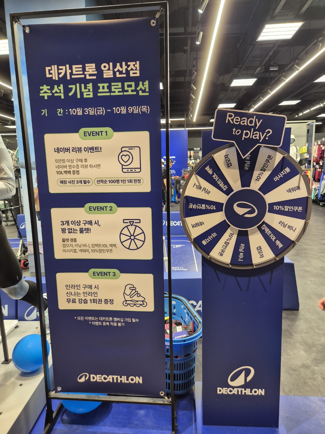 스포츠를 좋아하는 우리 가족에게 데카트론 매장은 특별한 즐거움을 선사했습니다. 매장 입구에는 "Ready to play?"라는 문구와 함께 룰렛 이벤트가 진행되고 있었습니다. 룰렛을 돌려 다양한 경품과 할인 쿠폰을 받을 수 있어 아이들이 정말 좋아했습니다.