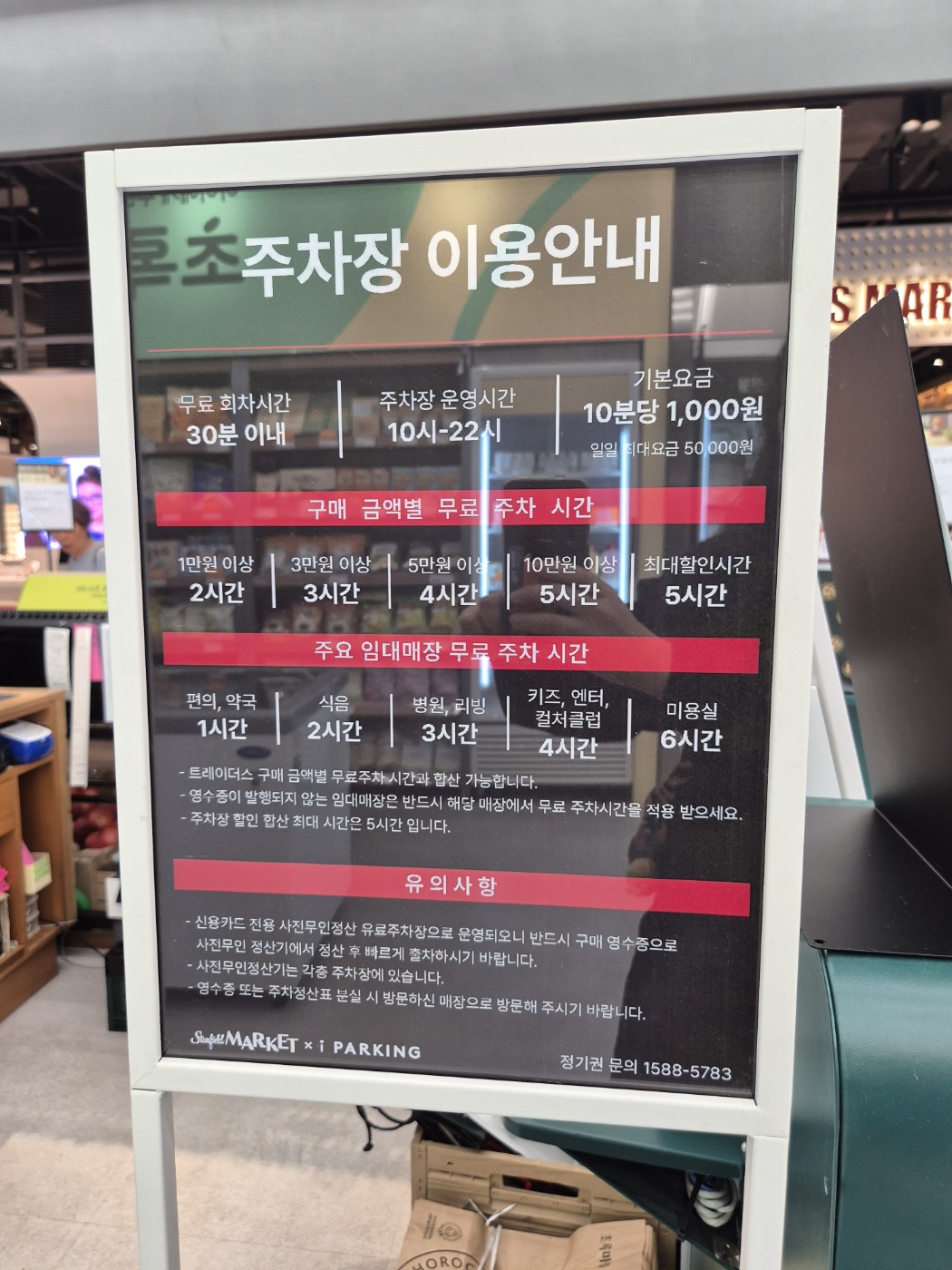 주차 요금은 기본 10분당 1,000원이며, 일일 최대 요금은 50,000원입니다. 구매 금액별로 무료 주차 시간이 제공되는데, 1만원 이상 구매 시 2시간, 3만원 이상 3시간, 5만원 이상 4시간, 10만원 이상은 5시간, 최대 할인 시 5시간 무료입니다.